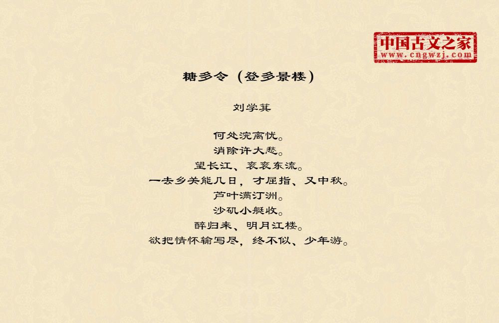 何处浣离忧。消除许大愁。望长江、衮衮东流。一去乡关能几日,才屈指、又中秋。芦叶满汀洲。沙矶小艇收。醉归来、明月江楼。欲把情怀输写尽,终不似、少年游。