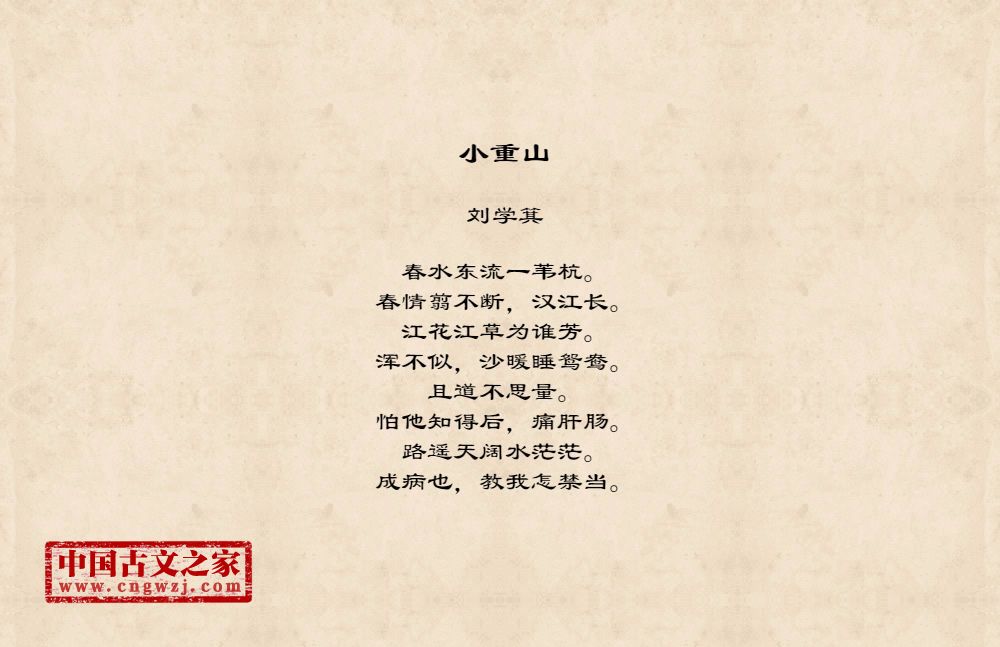 春水东流一苇杭。春情翦不断,汉江长。江花江草为谁芳。浑不似,沙暖睡鸳鸯。且道不思量。怕他知得后,痛肝肠。路遥天阔水茫茫。成病也,教我怎禁当。