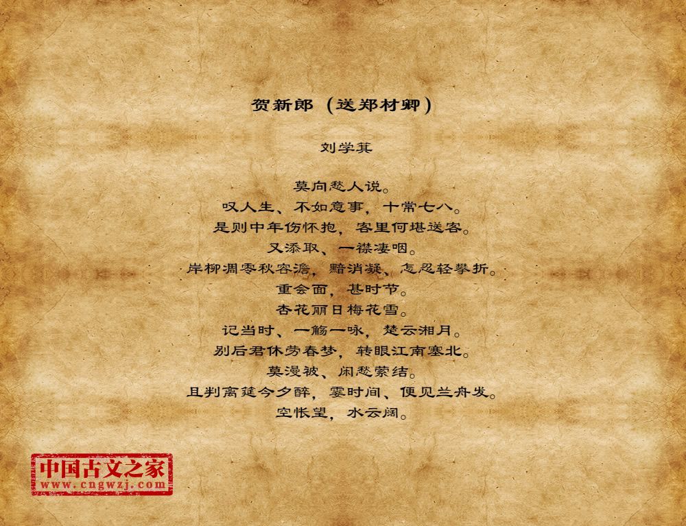 莫向愁人说。叹人生、不如意事,十常七八。是则中年伤怀抱,客里何堪送客。又添取、一襟凄咽。岸柳凋零秋容澹,黯消凝、怎忍轻攀折。重会面,甚时节。杏花丽日梅花雪。记当时、一觞一咏,楚云湘月。别后君休劳春梦,转眼江南塞北。莫漫被、闲愁萦结。且判离筵今夕醉,霎时间、便见兰舟发。空怅望,水云阔。