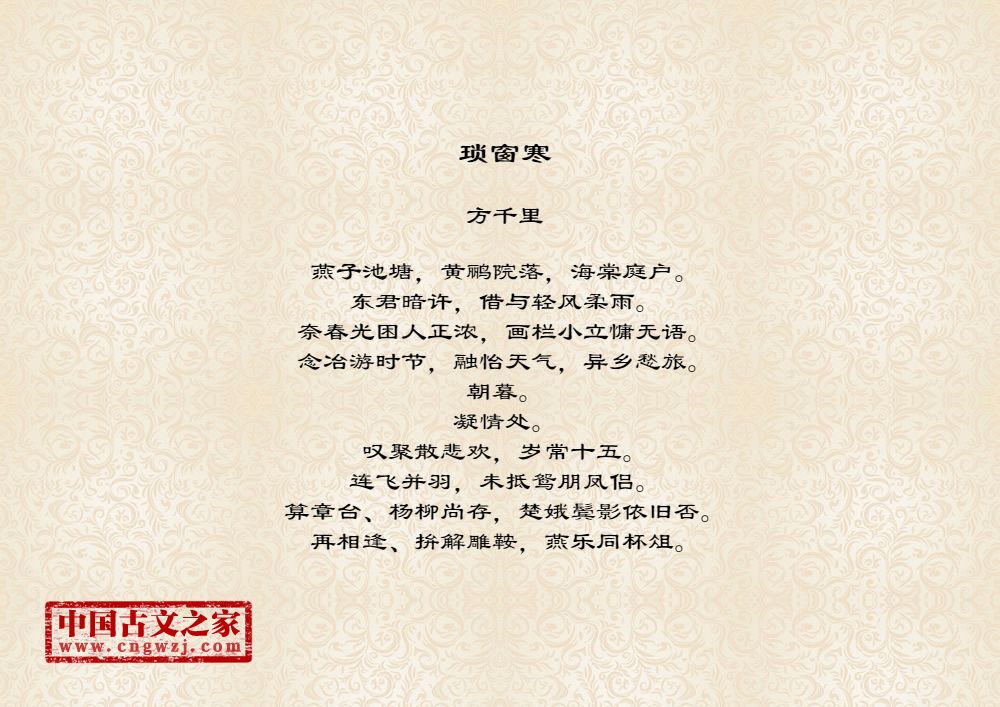 燕子池塘,黄鹂院落,海棠庭户。东君暗许,借与轻风柔雨。奈春光困人正浓,画栏小立慵无语。念冶游时节,融怡天气,异乡愁旅。朝暮。凝情处。叹聚散悲欢,岁常十五。连飞并羽,未抵鸳朋凤侣。算章台、杨柳尚存,楚娥鬓影依旧否。再相逢、拚解雕鞍,燕乐同杯俎。