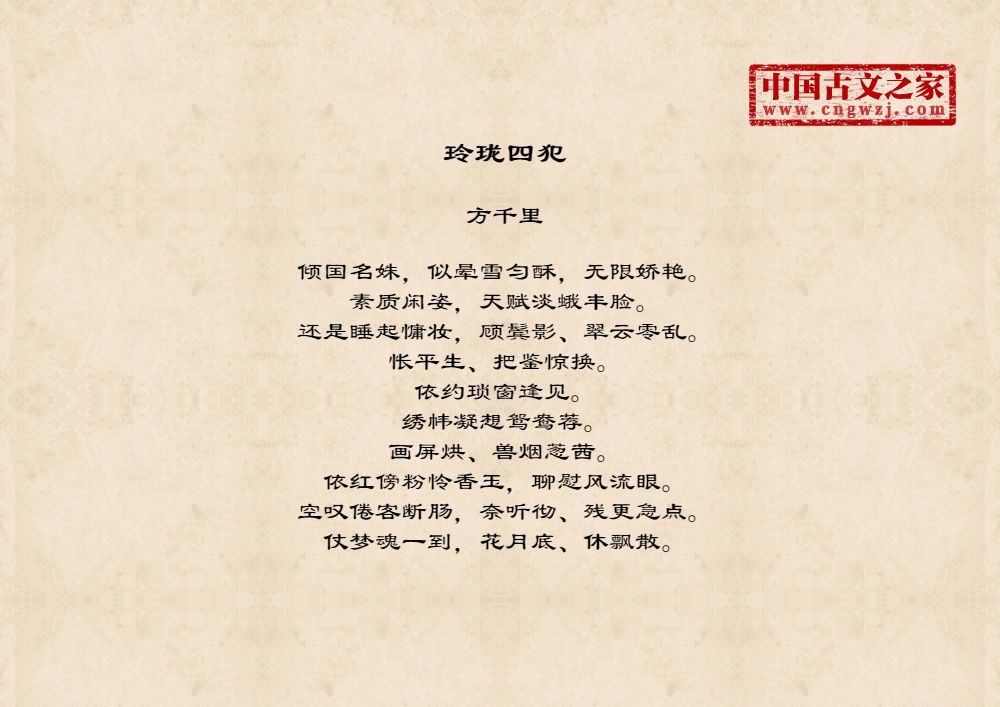 倾国名姝,似晕雪匀酥,无限娇艳。素质闲姿,天赋淡蛾丰脸。还是睡起慵妆,顾鬓影、翠云零乱。怅平生、把鉴惊换。依约琐窗逢见。绣帏凝想鸳鸯荐。画屏烘、兽烟葱茜。依红傍粉怜香玉,聊慰风流眼。空叹倦客断肠,奈听彻、残更急点。仗梦魂一到,花月底、休飘散。