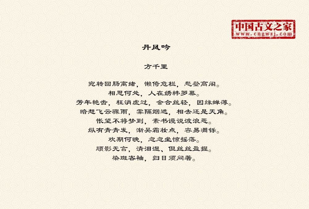 宛转回肠离绪,懒倚危栏,愁登高阁。相思何处,人在绣帏罗幕。芳年艳齿,枉消虚过,会合丝轻,因缘蝉薄。暗想飞云骤雨,雾隔烟遮,相去还是天角。怅望不将梦到,素书谩说波浪恶。纵有青青发,渐吴霜妆点,容易凋铄。欢期何晚,忽忽坐惊摇落。顾影无言,清泪湿、但丝丝盈握。染斑客袖,归日须问著。