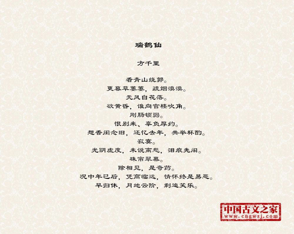 看青山绕郭。更暮草萋萋,疏烟漠漠。无风自花落。欲黄昏,谁向官楼吹角。刚肠顿弱。恨别来、辜负厚约。想香闺念旧,还忆去年,共举杯酌。寂寞。光阴虚度,未说离愁,泪痕先阁。珠帘翠幕。除相见,是奇药。况中年已后,凭高临远,情怀终是易恶。早归休,月地云阶,剩追笑乐。