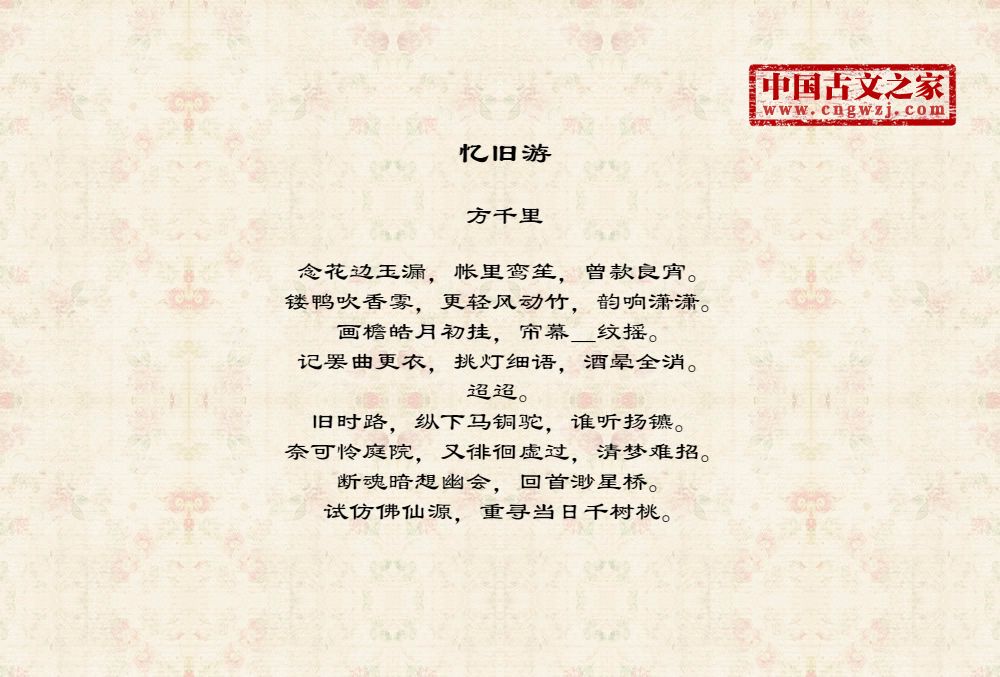 念花边玉漏,帐里鸾笙,曾款良宵。镂鸭吹香雾,更轻风动竹,韵响潇潇。画檐皓月初挂,帘幕_纹摇。记罢曲更衣,挑灯细语,酒晕全消。迢迢。旧时路,纵下马铜驼,谁听扬镳。奈可怜庭院,又徘徊虚过,清梦难招。断魂暗想幽会,回首渺星桥。试仿佛仙源,重寻当日千树桃。