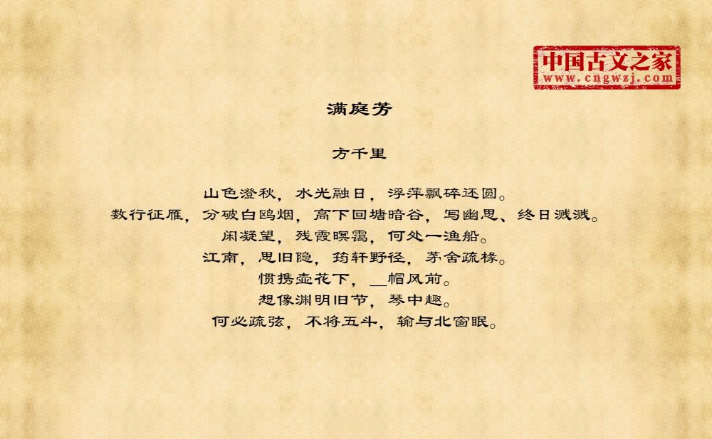 山色澄秋,水光融日,浮萍飘碎还圆。数行征雁,分破白鸥烟,高下回塘暗谷,写幽思、终日溅溅。闲凝望,残霞暝霭,何处一渔船。江南,思旧隐,筠轩野径,茅舍疏椽。惯携壶花下,_帽风前。想像渊明旧节,琴中趣。何必疏弦,不将五斗,输与北窗眠。