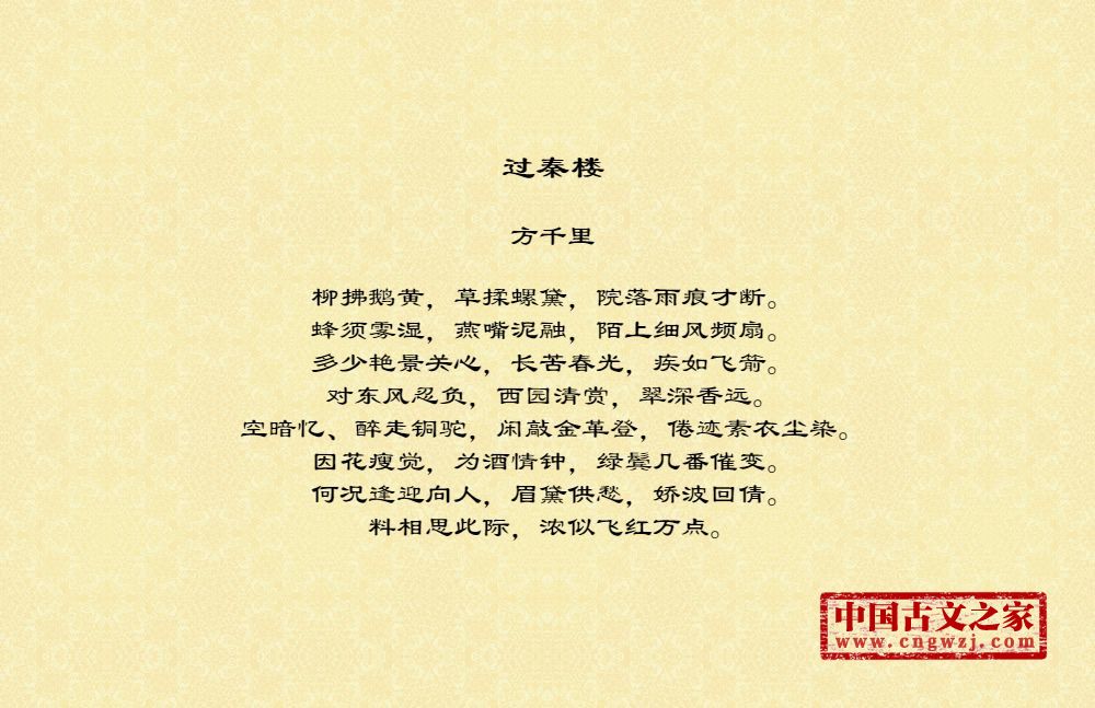 柳拂鹅黄,草揉螺黛,院落雨痕才断。蜂须雾湿,燕嘴泥融,陌上细风频扇。多少艳景关心,长苦春光,疾如飞箭。对东风忍负,西园清赏,翠深香远。空暗忆、醉走铜驼,闲敲金革登,倦迹素衣尘染。因花瘦觉,为酒情钟,绿鬓几番催变。何况逢迎向人,眉黛供愁,娇波回倩。料相思此际,浓似飞红万点。