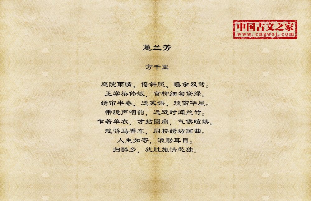 庭院雨晴,倚斜照、睡余双鹜。正学染修蛾,官柳细匀黛绿。绣帘半卷,透笑语、琐窗华屋。带脆声咽韵,远近时闻丝竹。乍著单衣,才拈圆扇,气候暄燠。趁骄马香车,同按绣坊画曲。人生如寄,浪勤耳目。归醉乡,犹胜旅情愁独。