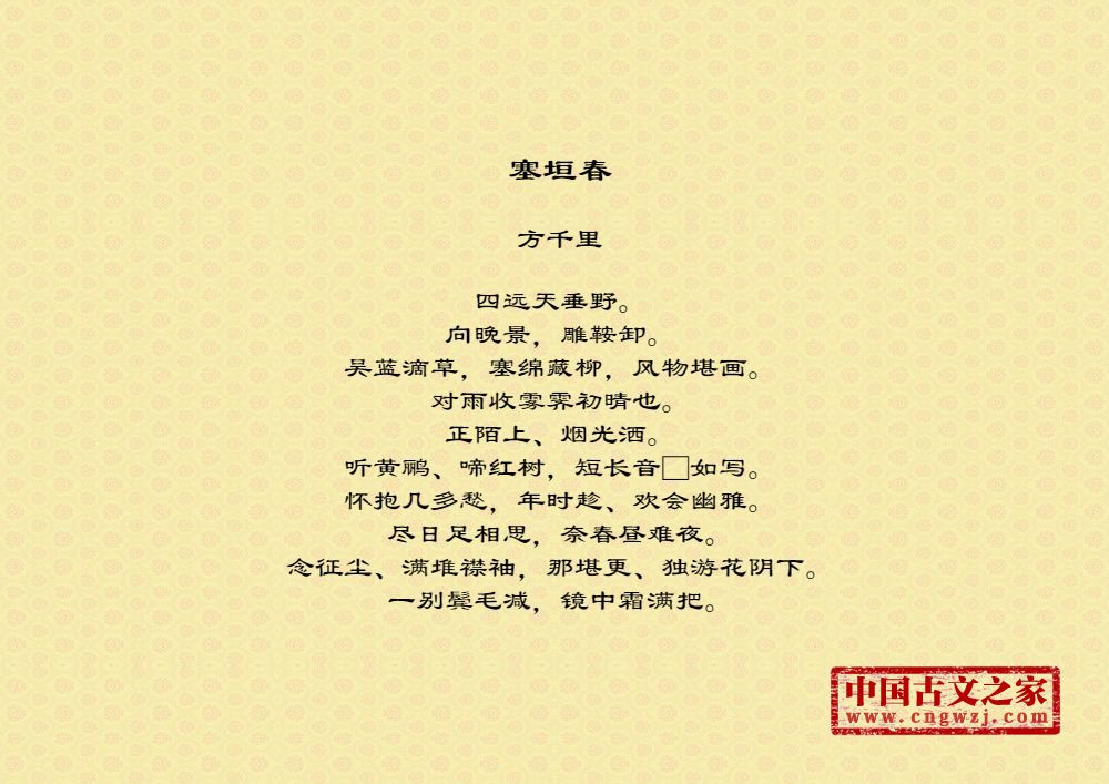 四远天垂野。向晚景,雕鞍卸。吴蓝滴草,塞绵藏柳,风物堪画。对雨收雾霁初晴也。正陌上、烟光洒。听黄鹂、啼红树,短长音□如写。怀抱几多愁,年时趁、欢会幽雅。尽日足相思,奈春昼难夜。念征尘、满堆襟袖,那堪更、独游花阴下。一别鬓毛减,镜中霜满把。