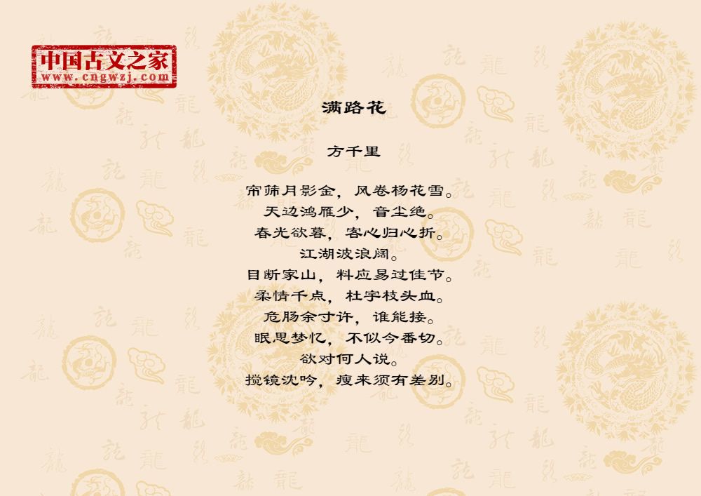帘筛月影金,风卷杨花雪。天边鸿雁少,音尘绝。春光欲暮,客心归心折。江湖波浪阔。目断家山,料应易过佳节。柔情千点,杜宇枝头血。危肠余寸许,谁能接。眠思梦忆,不似今番切。欲对何人说。搅镜沈吟,瘦来须有差别。
