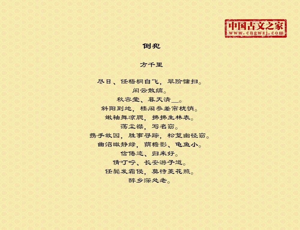 尽日、任梧桐自飞,翠阶慵扫。闲云散缟。秋容莹、暮天清_。斜阳到地,楼阁参差帘栊悄。嫩袖舞凉腮,拂拂生林表。荡尘襟,写名窈。携手故园,胜事寻踪,松篁幽径窈。曲沼瞰静绿,荫檐影、龟鱼小。信倦迹、归来好。倩叮咛、长安游子道。任鬓发霜侵,莫待菱花照。醉乡深处老。