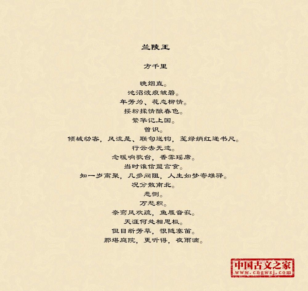 晚烟直。池沼波痕皱碧。年芳为、花态柳情。挼粉揉情酿春色。繁华记上国。曾识。倾城幼客,风流是、联句送钩,笺绿绡红递书尺。行云去无迹。念暖响歌台,香雾瑶席。当时谁信盟言食。知一岁离聚,几多间阻,人生如梦寄堠驿。况分散南北。悲恻。万愁积。奈鸾凤欢疏,鱼雁音寂。天涯何处相思极。但目断芳草,恨随塞笛。那堪庭院,更听得,夜雨滴。