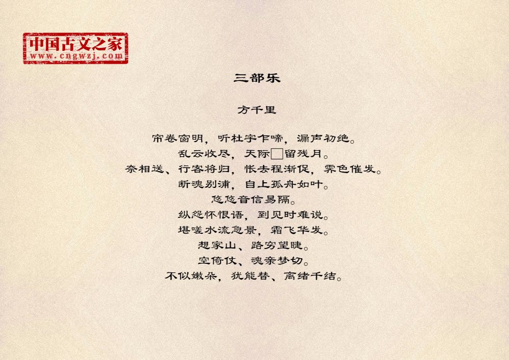 帘卷窗明,听杜宇乍啼,漏声初绝。乱云收尽,天际□留残月。奈相送、行客将归,怅去程渐促,霁色催发。断魂别浦,自上孤舟如叶。悠悠音信易隔。纵怨怀恨语,到见时难说。堪嗟水流急景,霜飞华发。想家山、路穷望睫。空倚仗、魂亲梦切。不似嫩朵,犹能替、离绪千结。