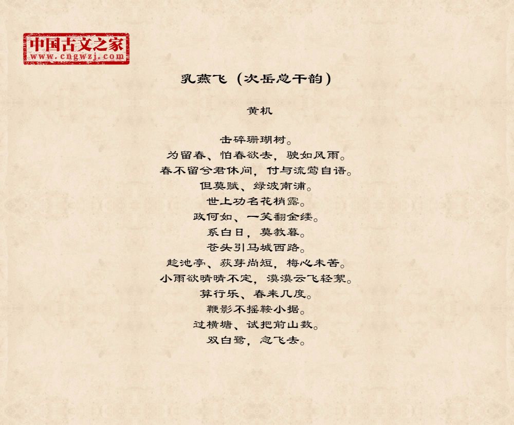 击碎珊瑚树。为留春、怕春欲去,驶如风雨。春不留兮君休问,付与流莺自语。但莫赋、绿波南浦。世上功名花梢露。政何如、一笑翻金缕。系白日,莫教暮。苍头引马城西路。趁池亭、荻芽尚短,梅心未苦。小雨欲晴晴不定,漠漠云飞轻絮。算行乐、春来几度。鞭影不摇鞍小据。过横塘、试把前山数。双白鹭,忽飞去。