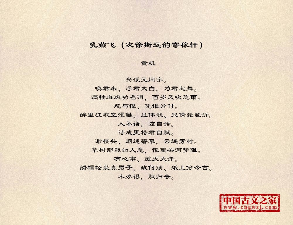 《乳燕飞(次徐斯远韵寄稼轩)》的原文打印版(黄机)