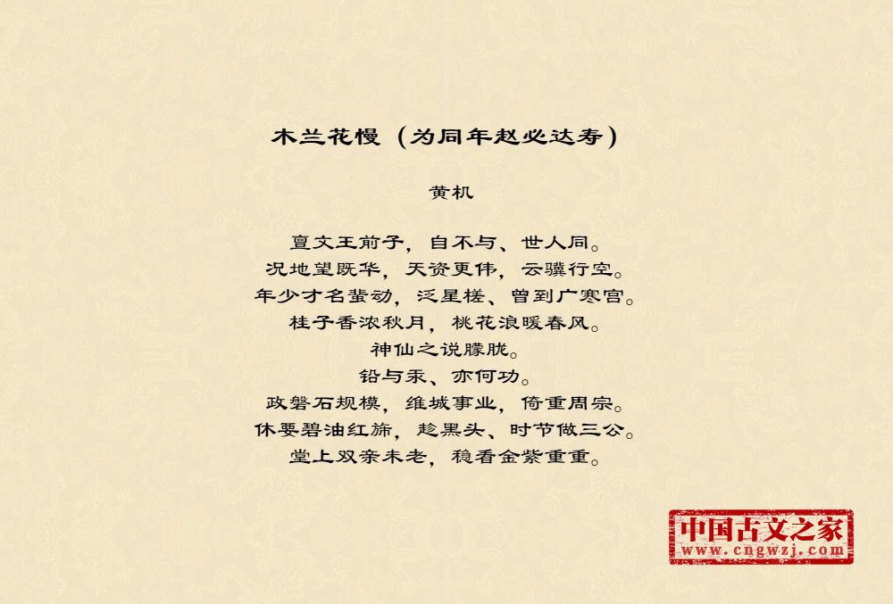《木兰花慢(为同年赵必达寿)》的原文打印版(黄机)