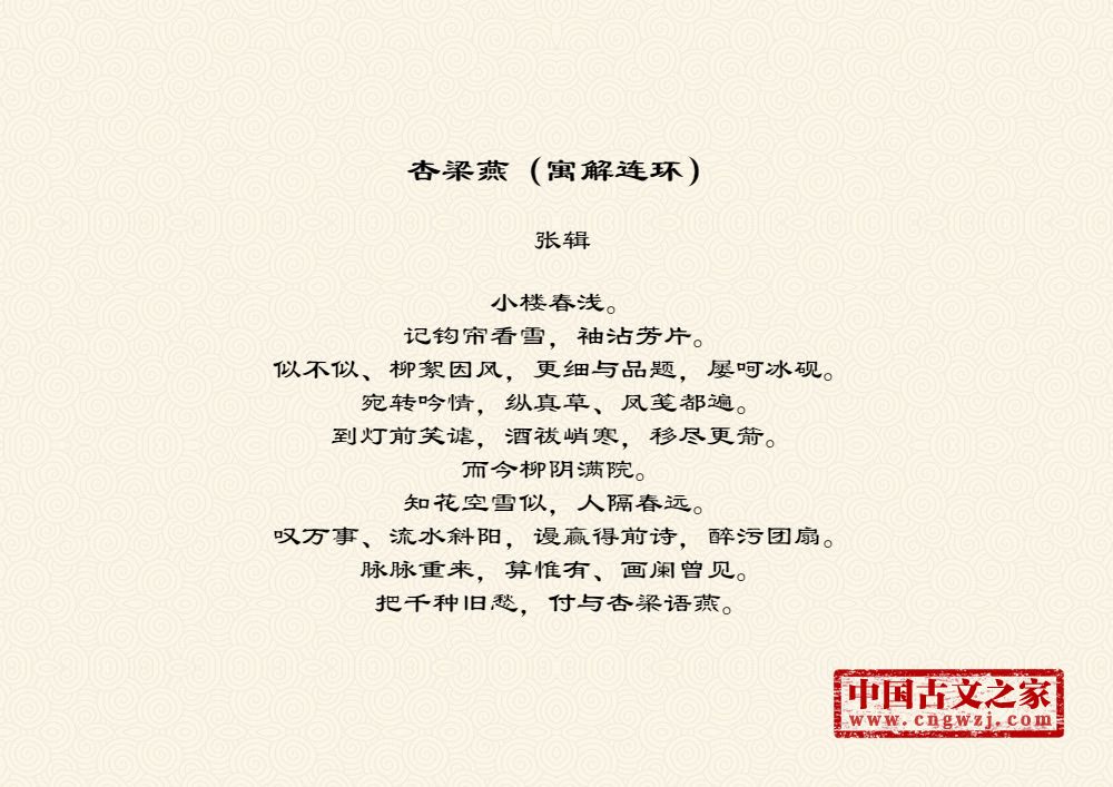小楼春浅。记钩帘看雪,袖沾芳片。似不似、柳絮因风,更细与品题,屡呵冰砚。宛转吟情,纵真草、凤笺都遍。到灯前笑谑,酒祓峭寒,移尽更箭。而今柳阴满院。知花空雪似,人隔春远。叹万事、流水斜阳,谩赢得前诗,醉污团扇。脉脉重来,算惟有、画阑曾见。把千种旧愁,付与杏梁语燕。