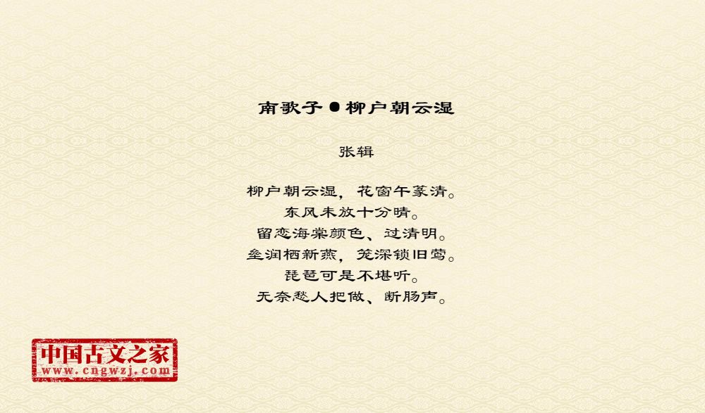 柳户朝云湿,花窗午篆清。东风未放十分晴。留恋海棠颜色、过清明。垒润栖新燕,笼深锁旧莺。琵琶可是不堪听。无奈愁人把做、断肠声。