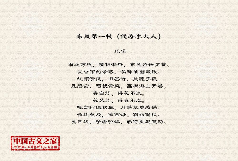 雨蕊方桃,晴梢渐杏,东风娇语弦管。爱香帘约余寒,唤舞袖翻嫩暖。红颜清健,旧墨竹、扶疏手段。且碧窗、写就黄庭,画楫海山开卷。春自好、得花不淡。花又好、得春不浅。晓莺瑶佩秋生,月蘸翠尊波满。长逢花处,笑西母、霜娥偷换。要日边、争看貂蝉,彩侍更迎宣劝。