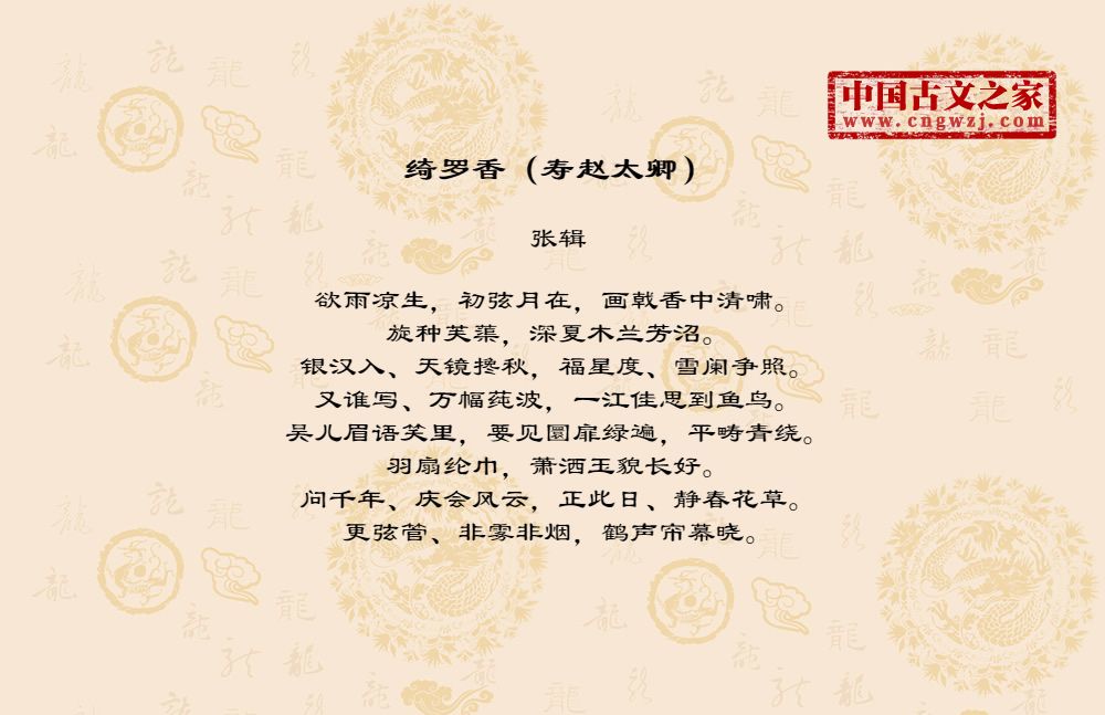欲雨凉生,初弦月在,画戟香中清啸。旋种芙蕖,深夏木兰芳沼。银汉入、天镜搀秋,福星度、雪阑争照。又谁写、万幅莼波,一江佳思到鱼鸟。吴儿眉语笑里,要见圜扉绿遍,平畴青绕。羽扇纶巾,萧洒玉貌长好。问千年、庆会风云,正此日、静春花草。更弦管、非雾非烟,鹤声帘幕晓。