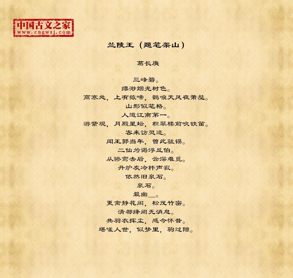 三峰碧。缥渺烟光树色。高寒处,上有猿啼,鹤唳天风夜萧瑟。山形似笔格。人道江南第一。游紫观,月殿星坛,积翠楼前吹铁笛。客来访灵迹。闻王郭当年,曾此驻锡。二仙为谒浮丘伯。从骖鸾去后,云深难觅。丹炉灰冷杵声寂。依然旧泉石。泉石。最幽_。更禽静花闲,松茂竹密。清都绛阙无消息。共羽衣挥尘,感今怀昔。堪嗟人世,似梦里,驹过隙。