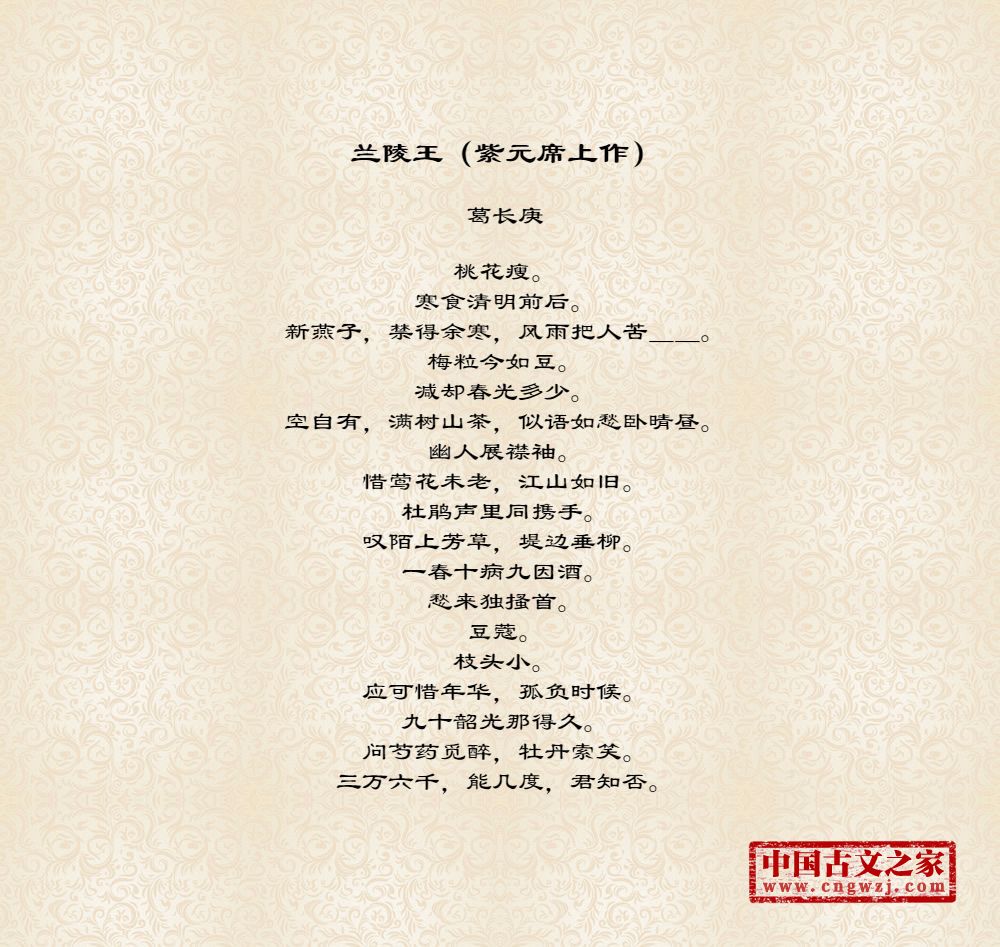 桃花瘦。寒食清明前后。新燕子,禁得余寒,风雨把人苦__。梅粒今如豆。减却春光多少。空自有,满树山茶,似语如愁卧晴昼。幽人展襟袖。惜莺花未老,江山如旧。杜鹃声里同携手。叹陌上芳草,堤边垂柳。一春十病九因酒。愁来独搔首。豆蔻。枝头小。应可惜年华,孤负时候。九十韶光那得久。问芍药觅醉,牡丹索笑。三万六千,能几度,君知否。