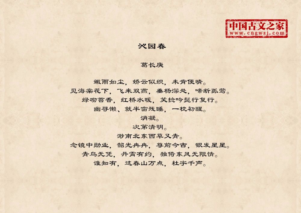 嫩雨如尘,娇云似织,未肯便晴。见海棠花下,飞来双燕,垂杨深处,啼断孤莺。绿砌苔香,红桥水暖,笑捻吟髭行复行。幽寻懒、就半窗残睡,一枕初醒。消凝。次第清明。渺南北东西草又青。念镜中勋业,韶光冉冉,尊前今古,银发星星。青鸟无凭,丹霄有约,独倚东风无限情。谁知有,这春山万点,杜宇千声。