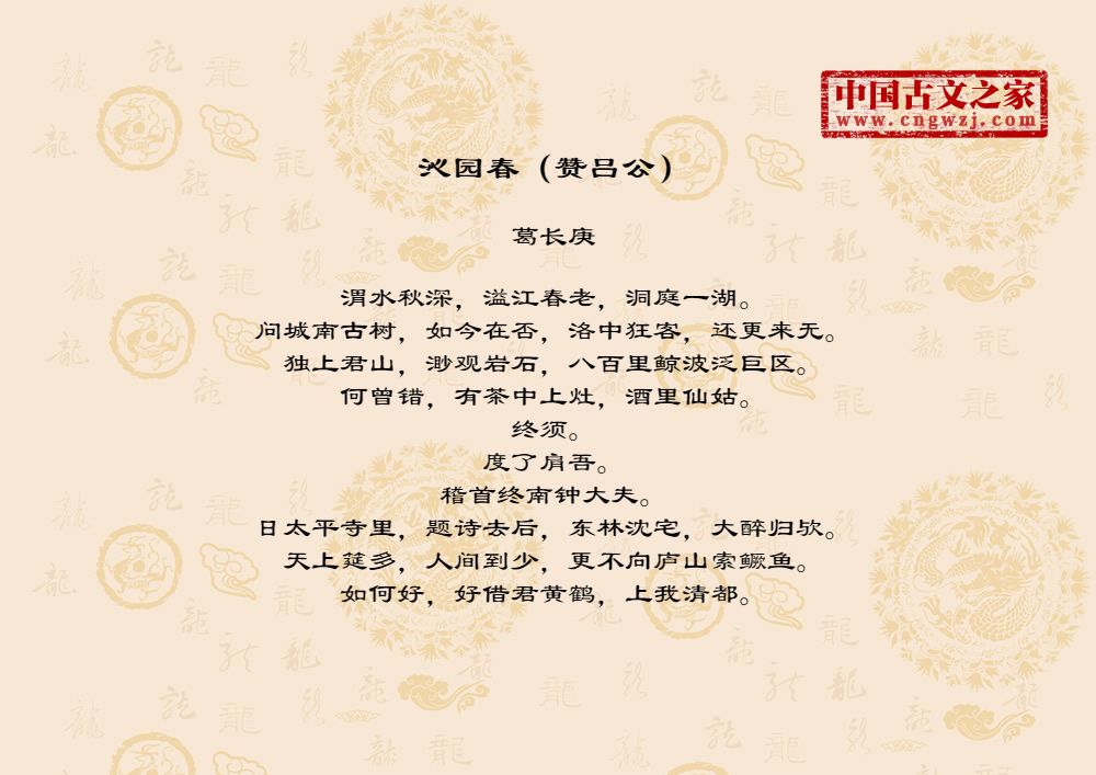 渭水秋深,溢江春老,洞庭一湖。问城南古树,如今在否,洛中狂客,还更来无。独上君山,渺观岩石,八百里鲸波泛巨区。何曾错,有茶中上灶,酒里仙姑。终须。度了肩吾。稽首终南钟大夫。日太平寺里,题诗去后,东林沈宅,大醉归欤。天上筵多,人间到少,更不向庐山索鳜鱼。如何好,好借君黄鹤,上我清都。