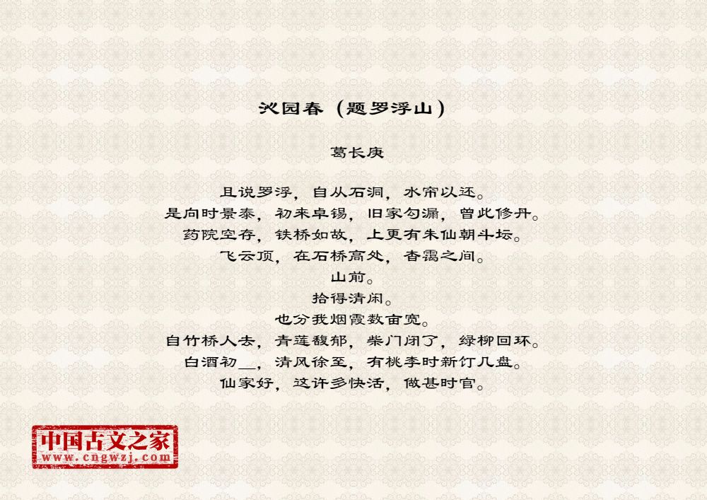 且说罗浮,自从石洞,水帘以还。是向时景泰,初来卓锡,旧家勾漏,曾此修丹。药院空存,铁桥如故,上更有朱仙朝斗坛。飞云顶,在石桥高处,杳霭之间。山前。拾得清闲。也分我烟霞数亩宽。自竹桥人去,青莲馥郁,柴门闭了,绿柳回环。白酒初_,清风徐至,有桃李时新饤几盘。仙家好,这许多快活,做甚时官。