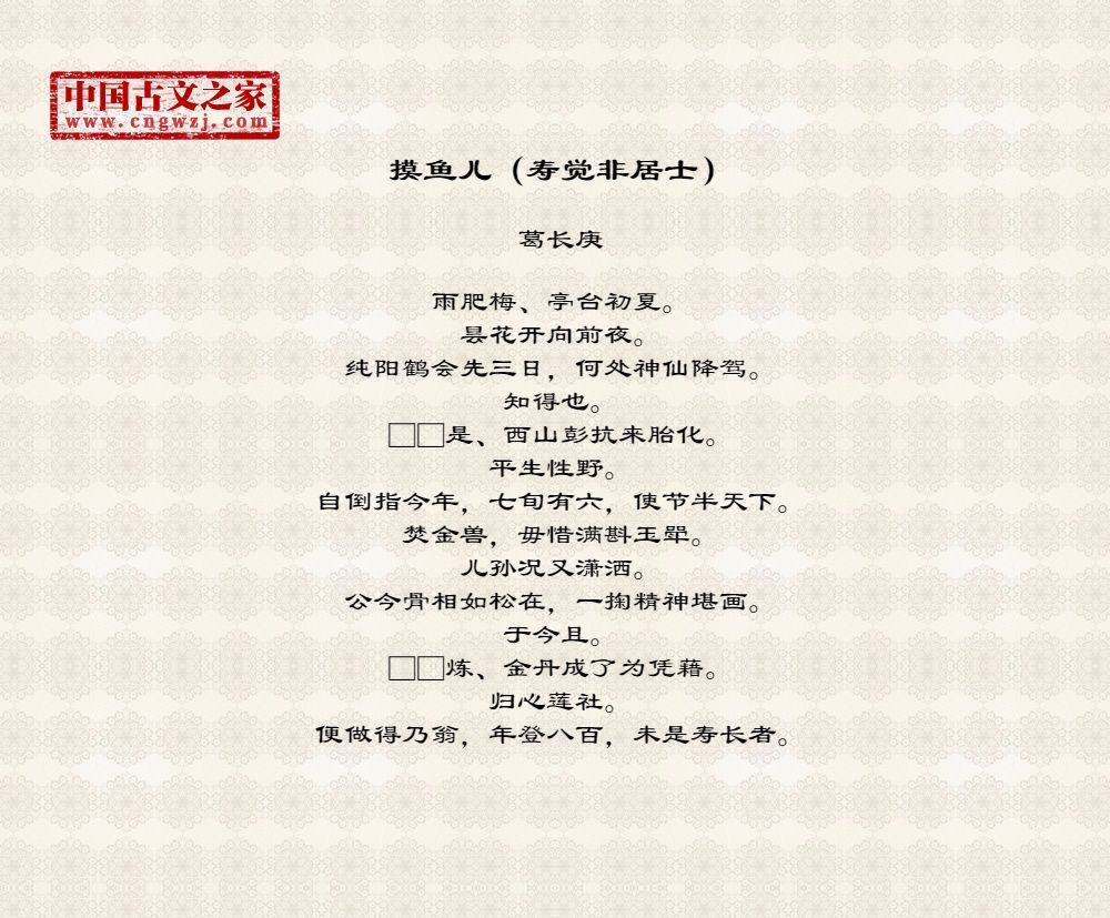 雨肥梅、亭台初夏。昙花开向前夜。纯阳鹤会先三日,何处神仙降驾。知得也。□□是、西山彭抗来胎化。平生性野。自倒指今年,七旬有六,使节半天下。焚金兽,毋惜满斟玉斝。儿孙况又潇洒。公今骨相如松在,一掬精神堪画。于今且。□□炼、金丹成了为凭藉。归心莲社。便做得乃翁,年登八百,未是寿长者。