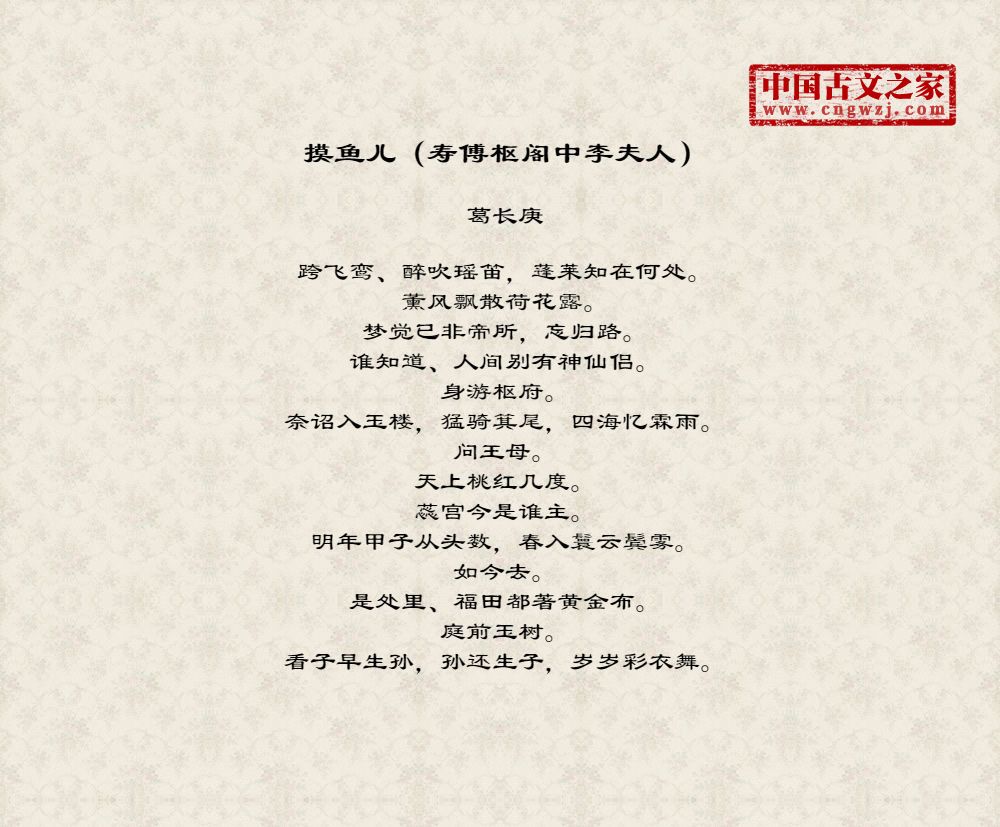 《摸鱼儿(寿傅枢阁中李夫人)》的原文打印版(葛长庚)