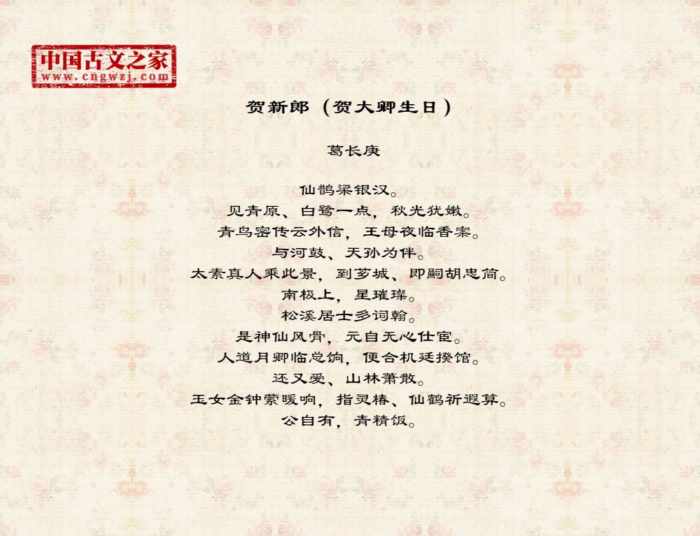 仙鹊梁银汉。见青原、白鹭一点,秋光犹嫩。青鸟密传云外信,王母夜临香案。与河鼓、天孙为伴。太素真人乘此景,到芗城、即嗣胡忠简。南极上,星璀璨。松溪居士多词翰。是神仙风骨,元自无心仕宦。人道月卿临总饷,便合机廷揆馆。还又爱、山林萧散。玉女金钟萦暖响,指灵椿、仙鹤祈遐算。公自有,青精饭。