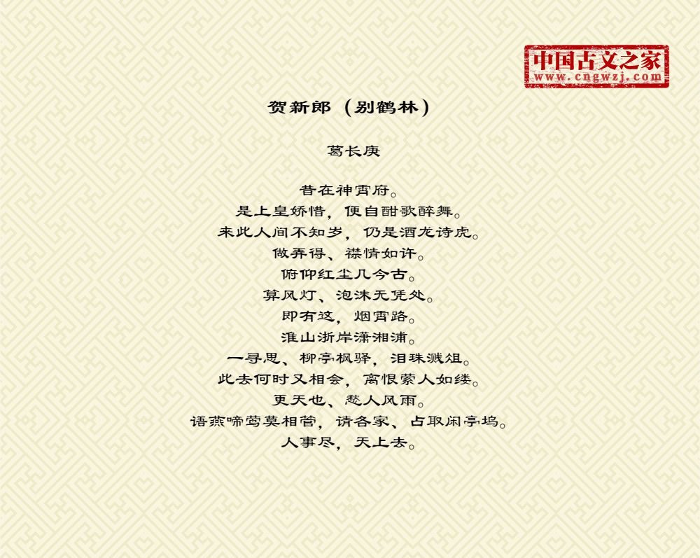 昔在神霄府。是上皇娇惜,便自酣歌醉舞。来此人间不知岁,仍是酒龙诗虎。做弄得、襟情如许。俯仰红尘几今古。算风灯、泡沫无凭处。即有这,烟霄路。淮山浙岸潇湘浦。一寻思、柳亭枫驿,泪珠溅俎。此去何时又相会,离恨萦人如缕。更天也、愁人风雨。语燕啼莺莫相管,请各家、占取闲亭坞。人事尽,天上去。