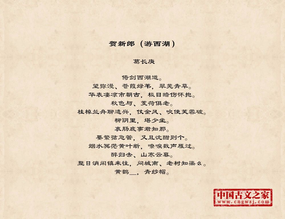 倚剑西湖道。望弥漫、苍葭绿苇,翠芜青草。华表凄凉市朝古,极目暗伤怀抱。秋色与、芰荷俱老。桂棹兰舟聊遣兴,仗金风、吹使芙蓉破。柳阴里,堪少坐。衷肠底事君知那。要繁弦急管,又且沈酣则个。烟水冥茫黄叶断,嘹唳数声雁过。醉归去、山寒云暮。整日消闲镇来往,问城南、老树知渠么。黄鹤_,青纱帽。