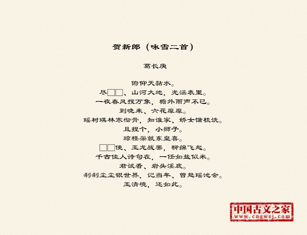 俯仰天黏水。尽□□、山河大地,光涵表里。一夜春风搜万象,檐外雨声不已。到晓来、六花靡靡。瑶树琪林寒彻骨,知谁家、娇女慵梳洗。且捏个,小狮子。琼楼架就东皇喜。□□使、玉龙战罢,柳绵飞起。千古佳人诗句在,一任如盐似米。君试看、岩头溪底。刹刹尘尘银世界,记当年、曾赴瑶池会。玉清境,还如此。