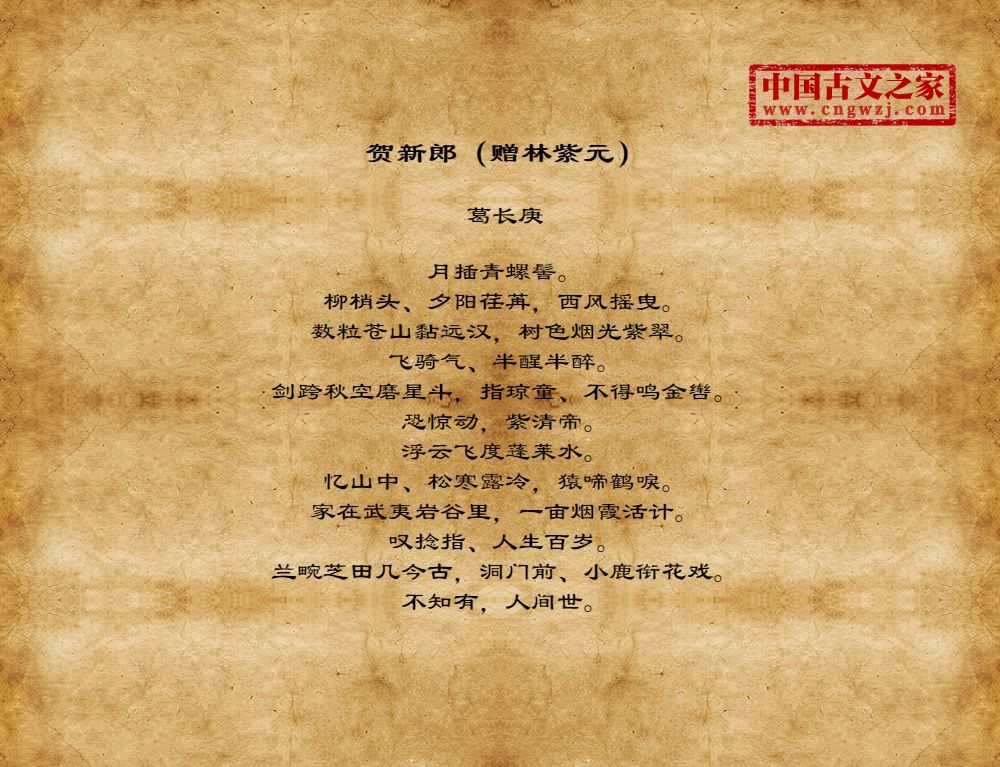 月插青螺髻。柳梢头、夕阳荏苒,西风摇曳。数粒苍山黏远汉,树色烟光紫翠。飞骑气、半醒半醉。剑跨秋空磨星斗,指琼童、不得鸣金辔。恐惊动,紫清帝。浮云飞度蓬莱水。忆山中、松寒露冷,猿啼鹤唳。家在武夷岩谷里,一亩烟霞活计。叹捻指、人生百岁。兰畹芝田几今古,洞门前、小鹿衔花戏。不知有,人间世。