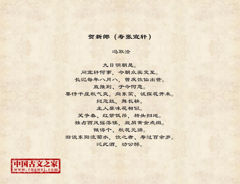 九日明朝是。问宜轩何事,今朝众宾交至。长记每年八月八,曾庆饮仙出世。直推到、于今何意。要待千崖秋气爽,向东篱、试探花开未。挝急鼓,舞长袂。主人臭味花相似。笑争春、红紫低昂,转头扫地。独占西风摇落候,旋屑黄金点缀。做得个、秋花元帅。旧说东阳流菊水,饮之者、寿过百余岁。泛此酒,劝公醉。