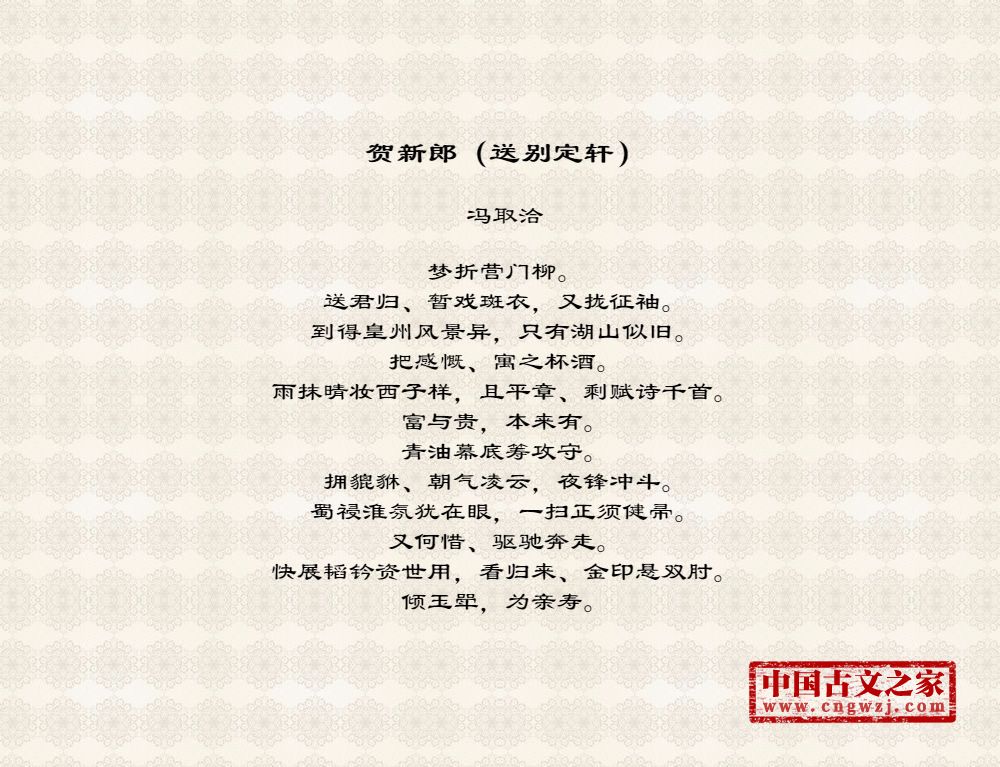 梦折营门柳。送君归、暂戏斑衣,又拢征袖。到得皇州风景异,只有湖山似旧。把感慨、寓之杯酒。雨抹晴妆西子样,且平章、剩赋诗千首。富与贵,本来有。青油幕底筹攻守。拥貔貅、朝气凌云,夜锋冲斗。蜀祲淮氛犹在眼,一扫正须健帚。又何惜、驱驰奔走。快展韬钤资世用,看归来、金印悬双肘。倾玉斝,为亲寿。
