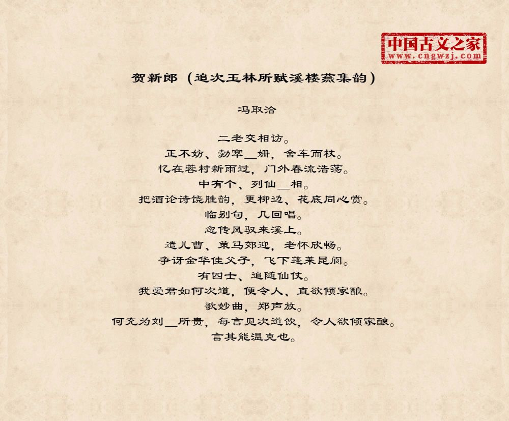 二老交相访。正不妨、勃窣_姗,舍车而杖。忆在蓉村新雨过,门外春流浩荡。中有个、列仙_相。把酒论诗饶胜韵,更柳边、花底同心赏。临别句,几回唱。忽传风驭来溪上。遣儿曹、策马郊迎,老怀欣畅。争讶金华佳父子,飞下蓬莱昆阆。有四士、追随仙仗。我爱君如何次道,便令人、直欲倾家酿。歌妙曲,郑声放。何充为刘_所贵,每言见次道饮,令人欲倾家酿。言其能温克也。