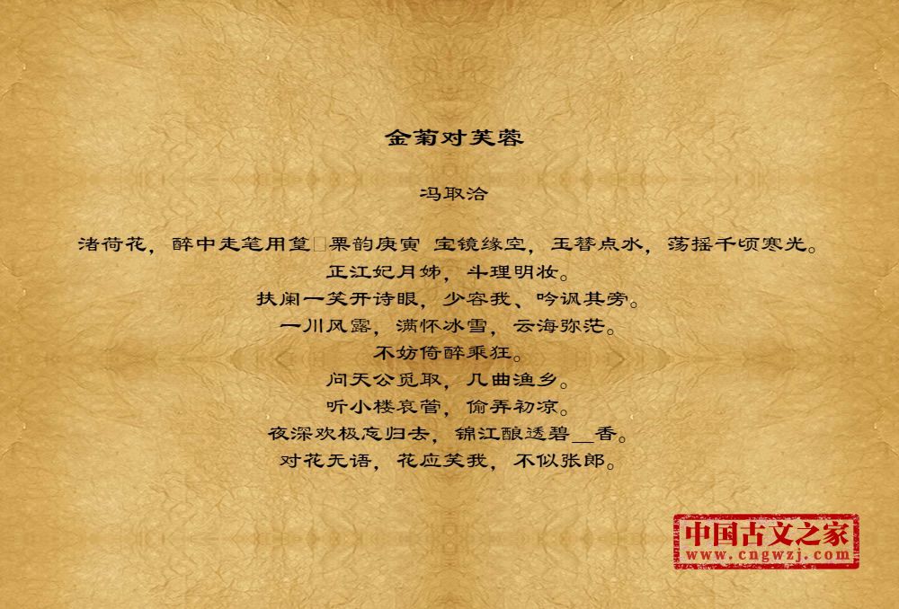 渚荷花,醉中走笔用篁栗韵庚寅 宝镜缘空,玉簪点水,荡摇千顷寒光。正江妃月姊,斗理明妆。扶阑一笑开诗眼,少容我、吟讽其旁。一川风露,满怀冰雪,云海弥茫。不妨倚醉乘狂。问天公觅取,几曲渔乡。听小楼哀管,偷弄初凉。夜深欢极忘归去,锦江酿透碧_香。对花无语,花应笑我,不似张郎。