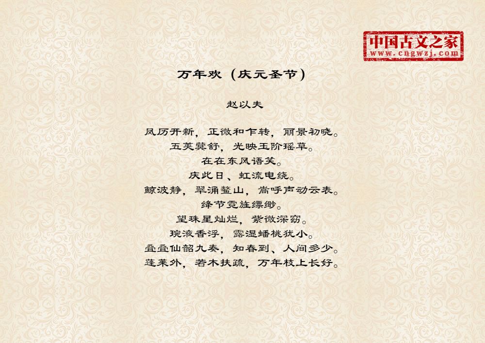 凤历开新,正微和乍转,丽景初晓。五荚蓂舒,光映玉阶瑶草。在在东风语笑。庆此日、虹流电绕。鲸波静,翠涌鳌山,嵩呼声动云表。绛节霓旌缥缈。望珠星灿烂,紫微深窈。琬液香浮,露湿蟠桃犹小。叠叠仙韶九奏,知春到、人间多少。蓬莱外,若木扶疏,万年枝上长好。