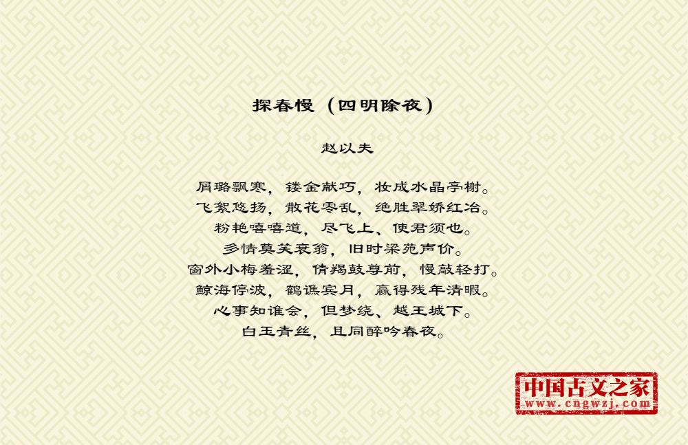 屑璐飘寒,镂金献巧,妆成水晶亭榭。飞絮悠扬,散花零乱,绝胜翠娇红冶。粉艳嘻嘻道,尽飞上、使君须也。多情莫笑衰翁,旧时梁苑声价。窗外小梅羞涩,倩羯鼓尊前,慢敲轻打。鲸海停波,鹤谯宾月,赢得残年清暇。心事知谁会,但梦绕、越王城下。白玉青丝,且同醉吟春夜。