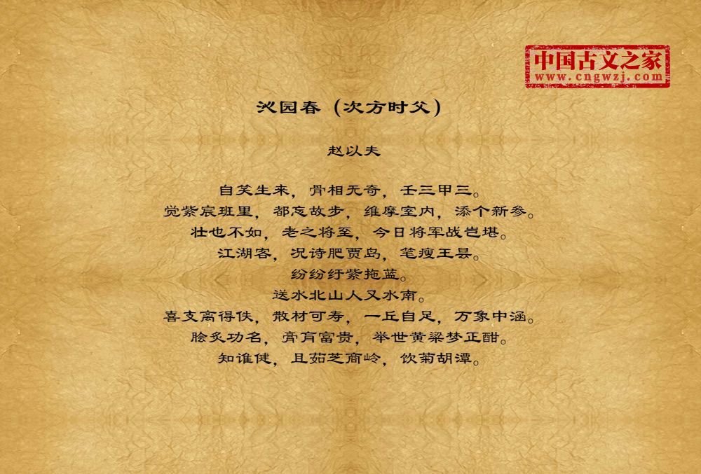 自笑生来,骨相无奇,壬三甲三。觉紫宸班里,都忘故步,维摩室内,添个新参。壮也不如,老之将至,今日将军战岂堪。江湖客,况诗肥贾岛,笔瘦王昙。纷纷纡紫拖蓝。送水北山人又水南。喜支离得佚,散材可寿,一丘自足,万象中涵。脍炙功名,膏肓富贵,举世黄粱梦正酣。知谁健,且茹芝商岭,饮菊胡潭。