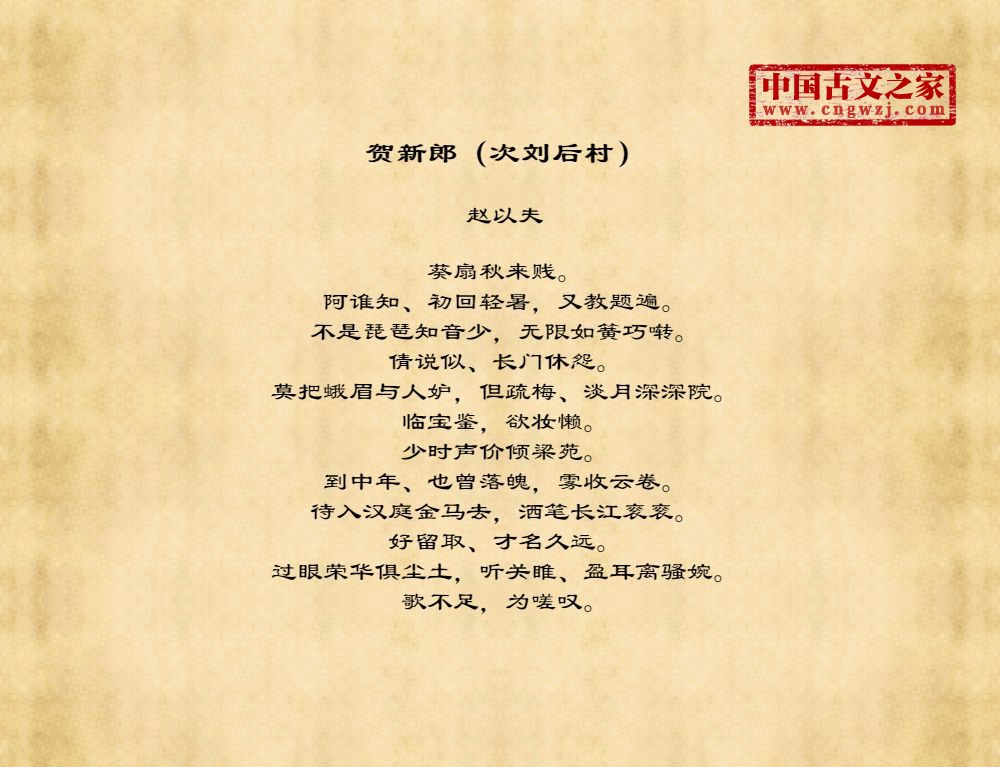 葵扇秋来贱。阿谁知、初回轻暑,又教题遍。不是琵琶知音少,无限如簧巧啭。倩说似、长门休怨。莫把蛾眉与人妒,但疏梅、淡月深深院。临宝鉴,欲妆懒。少时声价倾梁苑。到中年、也曾落魄,雾收云卷。待入汉庭金马去,洒笔长江衮衮。好留取、才名久远。过眼荣华俱尘土,听关睢、盈耳离骚婉。歌不足,为嗟叹。