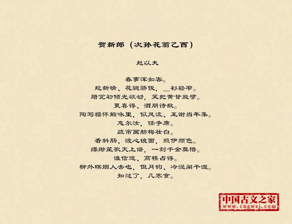 赵以夫(一一八九~一二五六),字用父,号虚斋。居长乐(今属福建)。宁宗嘉定十年(一二一七)进士。知监利县。理宗端平初知漳州。嘉熙初以枢密都丞旨兼国史院