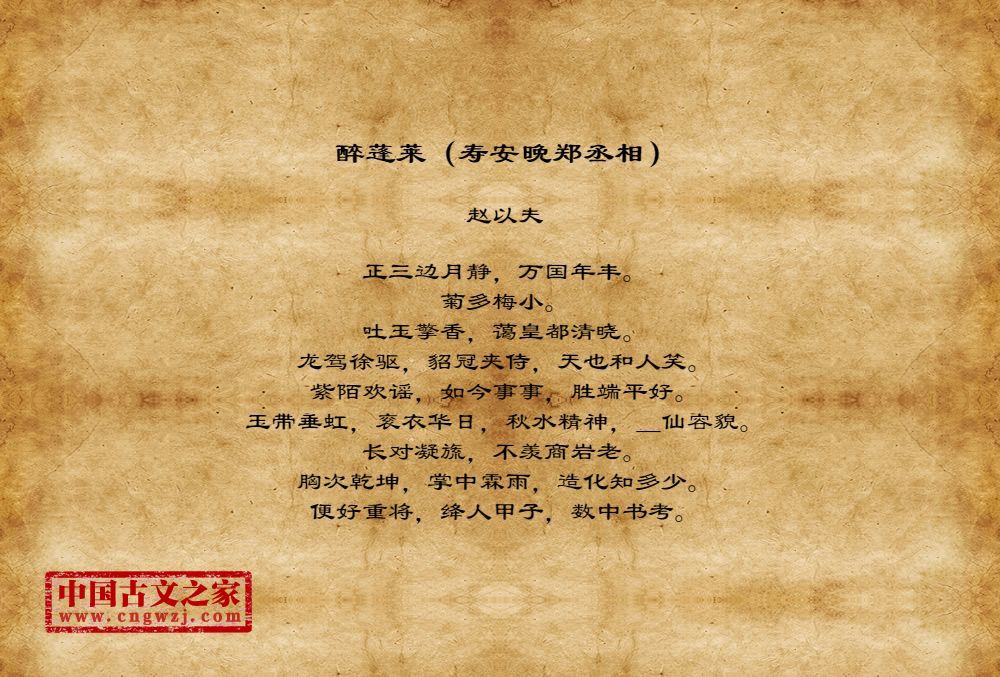 正三边月静,万国年丰。菊多梅小。吐玉擎香,蔼皇都清晓。龙驾徐驱,貂冠夹侍,天也和人笑。紫陌欢谣,如今事事,胜端平好。玉带垂虹,衮衣华日,秋水精神,_仙容貌。长对凝旒,不羡商岩老。胸次乾坤,掌中霖雨,造化知多少。便好重将,绛人甲子,数中书考。