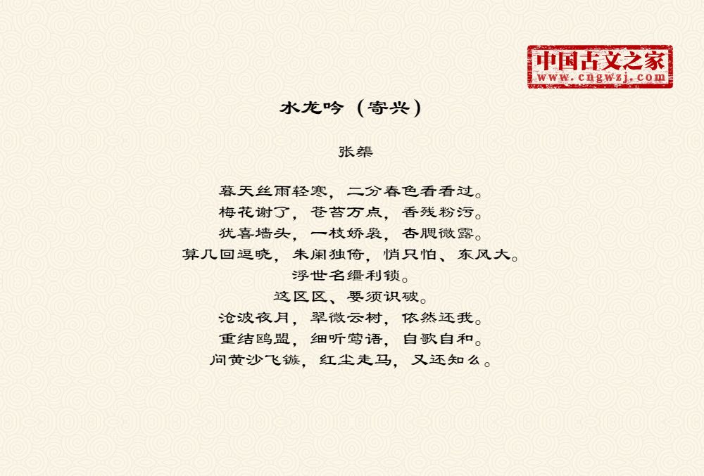 暮天丝雨轻寒,二分春色看看过。梅花谢了,苍苔万点,香残粉污。犹喜墙头,一枝娇袅,杏腮微露。算几回逗晓,朱阑独倚,悄只怕、东风大。浮世名缰利锁。这区区、要须识破。沧波夜月,翠微云树,依然还我。重结鸥盟,细听莺语,自歌自和。问黄沙飞镞,红尘走马,又还知么。
