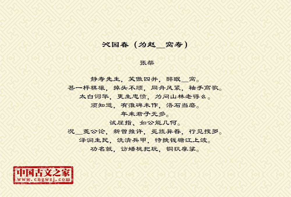 静寿先生,笑傲四并,醉眠_窝。甚一枰棋壤,掉头不顾,同舟风紧,袖手高歌。太白词华,更生忠愤,为问山林老得么。须知道,有淮碑未作,浯石当磨。年来君子无多。试屈指、如公能几何。况_荛公论,新曾推许,冕旒异眷,行见搜罗。泽润生民,洗清兵甲,待挽钱塘江上波。功名就,访蟠桃把玩,铜狄摩挲。