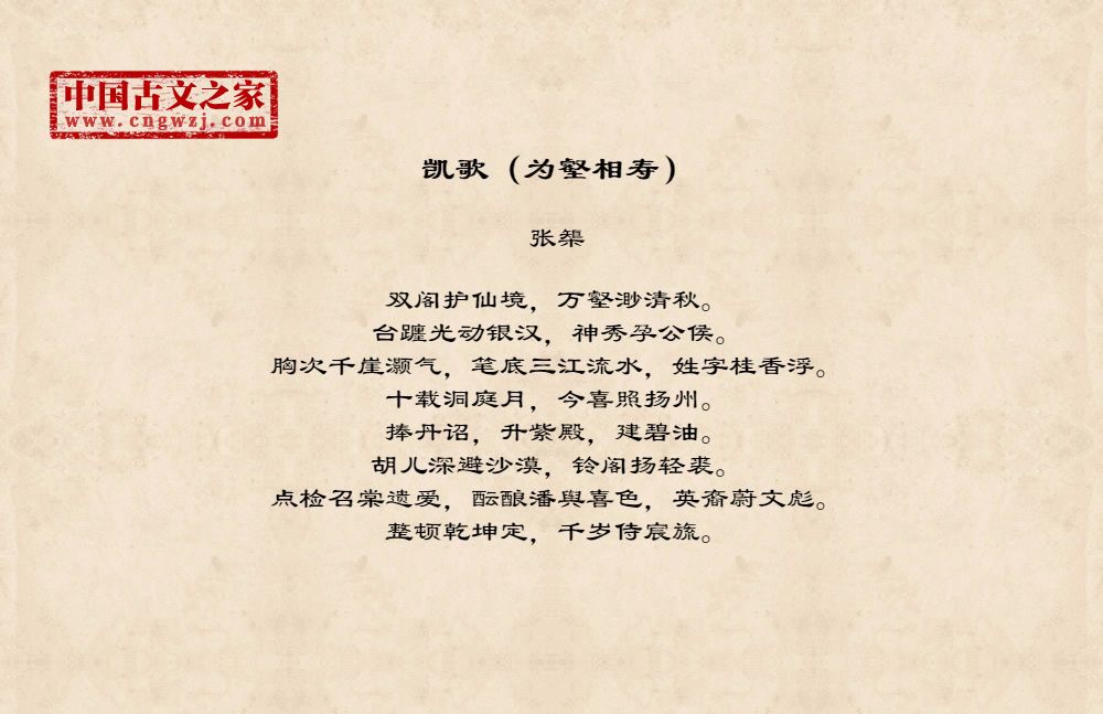 双阁护仙境,万壑渺清秋。台躔光动银汉,神秀孕公侯。胸次千崖灏气,笔底三江流水,姓字桂香浮。十载洞庭月,今喜照扬州。捧丹诏,升紫殿,建碧油。胡儿深避沙漠,铃阁扬轻裘。点检召棠遗爱,酝酿潘舆喜色,英裔蔚文彪。整顿乾坤定,千岁侍宸旒。