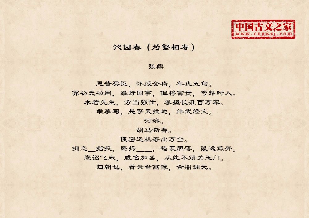 思昔买臣,怀绶会稽,年犹五旬。算初无功用,维持国事,但将富贵,夸耀时人。未若先生,方当强仕,掌握长淮百万军。难摹写,是擎天拄地,纬武经文。河滨。胡马嘶春。便密运机筹出万全。拥态_指授,鹰扬__,毡裘胆落,鼠逸狐奔。褒诏飞来,威名加盛,从此不须关玉门。归朝也,看云台画像,金鼎调元。