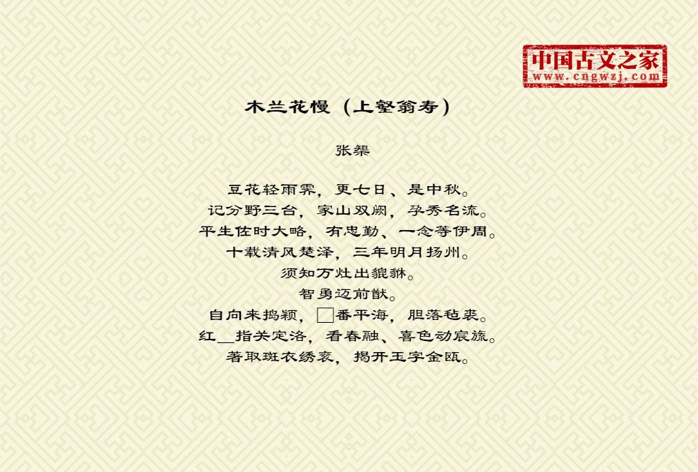 豆花轻雨霁,更七日、是中秋。记分野三台,家山双阙,孕秀名流。平生佐时大略,有忠勤、一念等伊周。十载清风楚泽,三年明月扬州。须知万灶出貔貅。智勇迈前猷。自向来捣颖,□番平海,胆落毡裘。红_指关定洛,看春融、喜色动宸旒。著取斑衣绣衮,揭开玉字金瓯。
